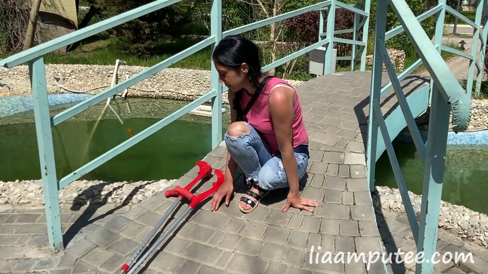In this video, Lia is walking through the hotel park, posing on a swing and a bench, playing with her stump and toes on her single leg.Many scenes of footfetish and stump plays.